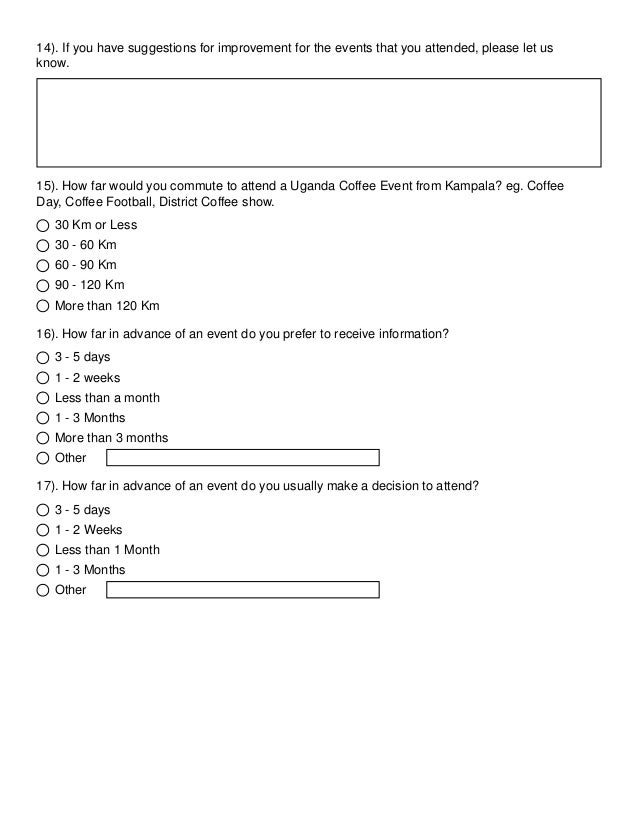 Sample questions and questionnaire examples for customer satisfaction surveys, client surveys, product surveys, market research surveys, employee surveys and more! Our event survey tips and examples are designed to help you collect feedback and draw meaningful conclusions for your next event. This survey template can be used to collect feedback on an event when it is over.