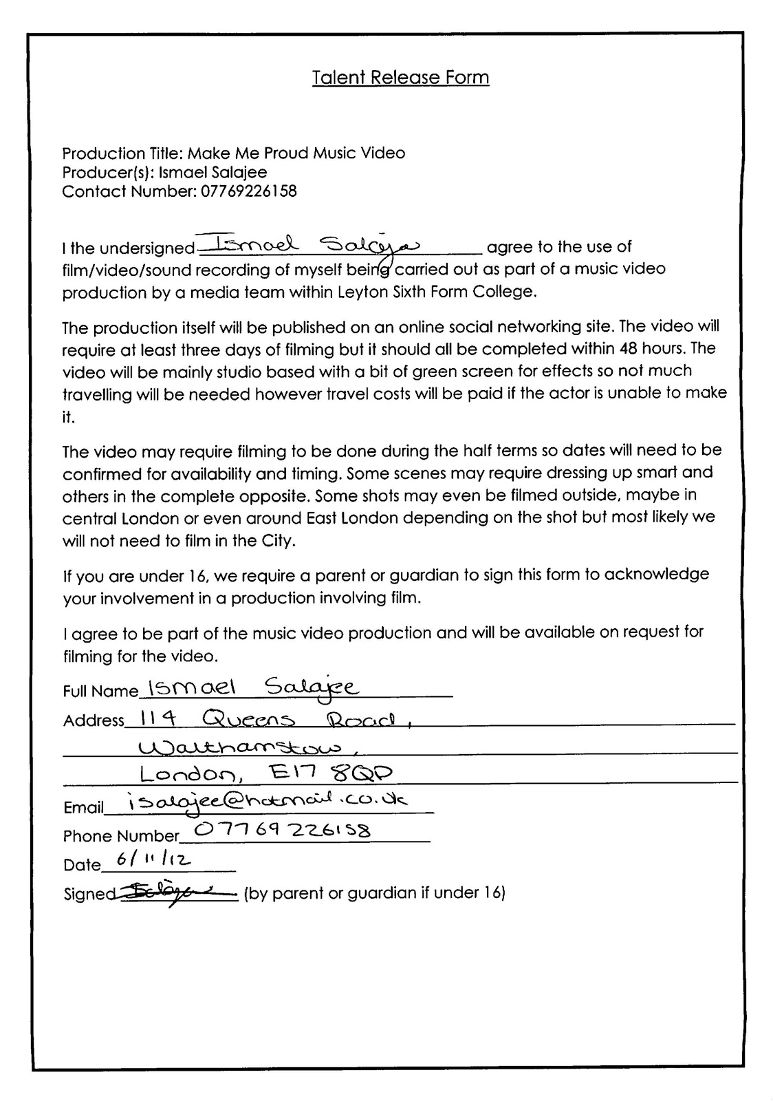 One such act is seeking permissions of concerned to release videos or audios pertaining to others. There is no need for a video release form if a person in a video cannot be identified. Talent release form for actors: Whilst some people tend to rely on a verbal release of having your talent say 'i consent to be interviewed on.